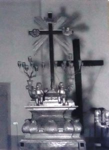 Presenta una “base quadrangolare con perimetro mistilineo, è dipinta in finto marmo ed è impreziosita da un motivo di foglie dorate. Nel registro superiore figurano due angeli negli spigoli anteriori, ai cui lati esterni si ergono due torce reggi candele, mentre nell’estremità posteriore è posta la croce raggiata con due cherubini e la sigla I.N.R.I”[1]