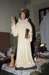 La Confraternita di S. Croce commissiona, nell’ultimo quarto del XV secolo, la realizzazione dell’altare di Sant’Egidio del quale restano la statua lignea[1] del santo attribuita a Saturnino Gatti. Realizzata, in origine, per la chiesa di Sant’Agostino, la statua rimane legata alle vicende dell’altare di S. Egidio fino agli anni Cinquanta del Novecento quando fu collocata in cattedrale su una macchina lignea proveniente dalla chiesa della Trinità.
