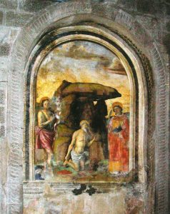 Antonio del Massaro, detto il Pastura (attrib.), sec. XVI metà, S. Girolamo con i ss. Giovanni Battista e Lorenzo, affresco, cm. 300×270.